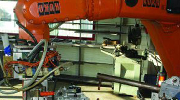 Bei diesem Industrieroboter wurde ein starres Rohr zwischen der 3. und 6. Achse durch eine dreidimensionale triflex® R-Energiekette ersetzt.