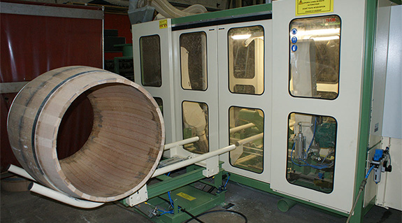 In dieser Schleifmaschine für Holzfässer garantieren unsere schmiermittelfreien Linearführungen und Gleitlager eine hohe Standzeit.