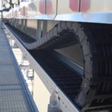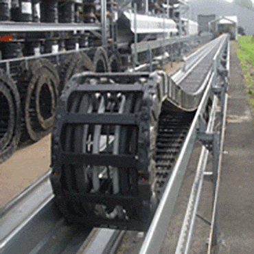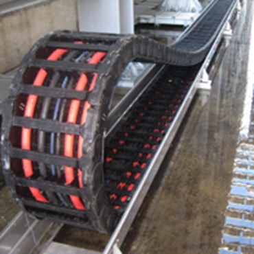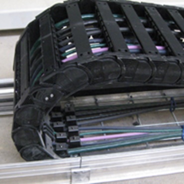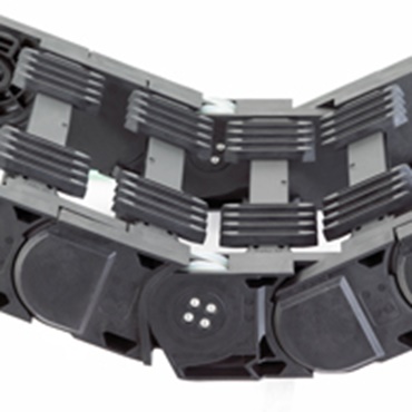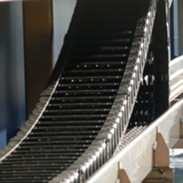 P4.80 Profil-Rollen e-kette® auf langem Weg mit drei Mittellaschen und hoher Befüllung. Die Öffnungsstege halten das Leitungspaket sicher in der Kette.