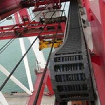 Leitungsführung für die Katzfahrt (118,5 m) auf einem Containerkran mit einer P4.56R Profil-Rollen e-kette®. Leises und sicheres P4-System im Dauereinsatz bei 240 m/min Verfahrgeschwindigkeit. Die P4.56R hat eine Zusatzlast von 2,6 kg/m und ist bestückt mit folgenden igus® chainflex® Leitungen, CF330 1x25mm² Einzelader, CF9 12G2,5mm² Steuerleitung, CFLG.12G Lichtwellenleiter und CF11 Datenleitung.