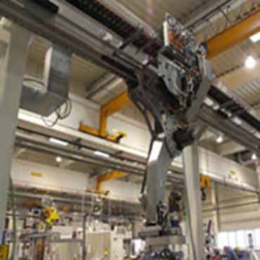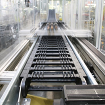 Die P4 Rollen e-kette® P4.42R hält der hohen Beschleunigung (17 m/s²) und Geschwindigkeit (6 m/s) in diesem Handlingportal auf Dauer Stand.