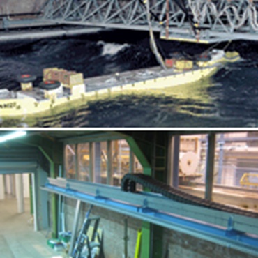 Testanlage zur Optimierung von Schiffsantrieben. Eine Brücke zieht die Schiffsmodelle mit bis zu 4 m/s. Um die sensiblen Meßinstrumente nicht zu beeinflussen ist eine vibrationsarme e-kette® (System P4.80R) auch bei hohen Beschleunigungen und Geschwindigkeiten wichtig.