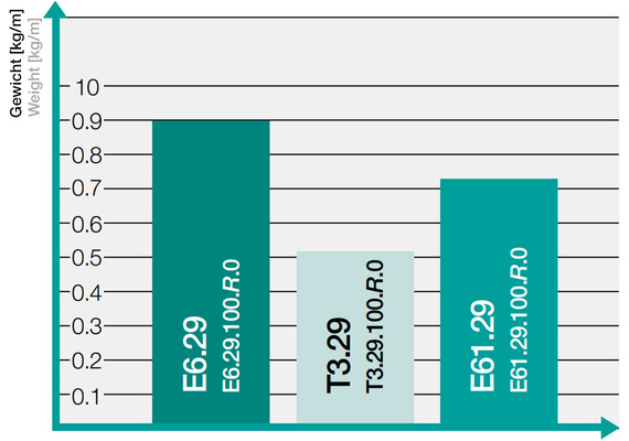 • Gewichtsersparnis von ca. 30 % im Vergleich zum System E6