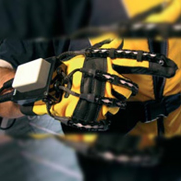 igus® Serie E03 an einem Datenhandschuh zum Schutz der Sensoren, sodass die Handschuhe einfacher an- und ausgezogen werden können. Innenhöhe nur 5 mm.