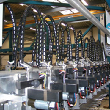 Viele Leitungen dicht gepackt in einer e-kette®. Dank glatter Kontur leitungsschonend geführt.