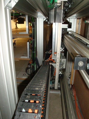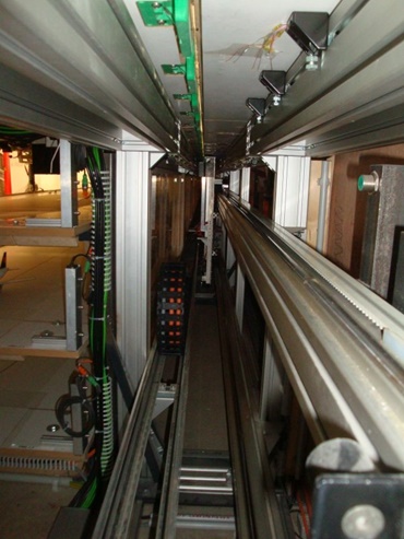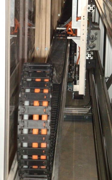 Das sogenannte „Start- und Landekatapult“ wird mittels zwei gegenläufig installierten E2/000 e-ketten® der Serie 255 versorgt, welche in einer Super Alu Rinne mit Dämpfungsprofil verbaut wurden. Der Grund für den Einsatz der Energiekette war ihre kleine Teilung, wodurch beim Abrollen im Radius nur ein sehr geringer Polygoneffekt erzielt wurde. Zudem war das Ziel eine sehr geräuscharme Lösung, da die e-ketten® im laufenden Betrieb nicht zu hören sein durfte, wodurch zusätzlich das Dämpfungsprofil in der Führungsrinne eingesetzt wurde.