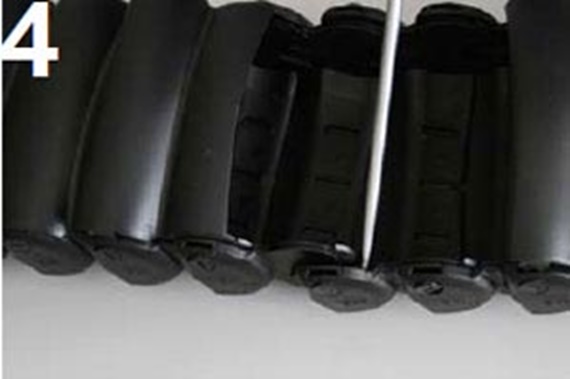 Entnehmen Sie dann 1 Deckel vor, 1 nach dem auszutauschenden Kettenglied, sowie den des Auszutauschenden selbst, so dass 2 Glieder offen sind.