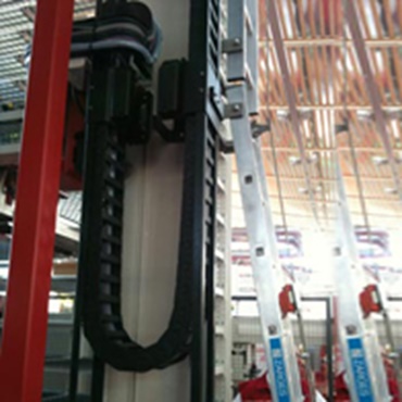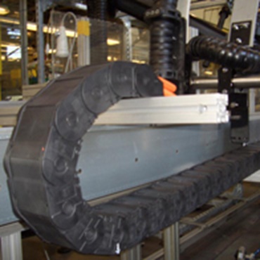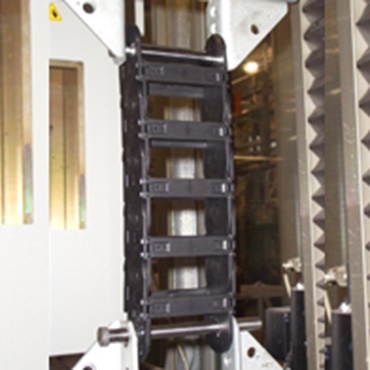 Die E2/000 e-kette® sorgt für die Energieversorgung der X- und Y-Achse. Dank der zu öffnenden und sicher sitzenden Stege sind ein nachträgliches Befüllen und hohe Geschwindigkeiten mühelos möglich.