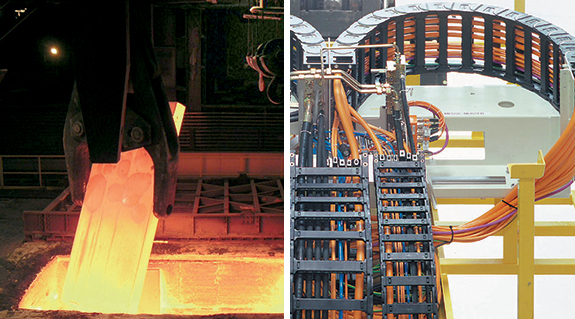 In diesem Stahlwerk wurde eine Metallkette durch eine seit 2007 ausfallfreie Kunststoff-Energiekette zusammen mit für bewegte Anwendungen konzipierten chainflex Leitungen ersetzt.