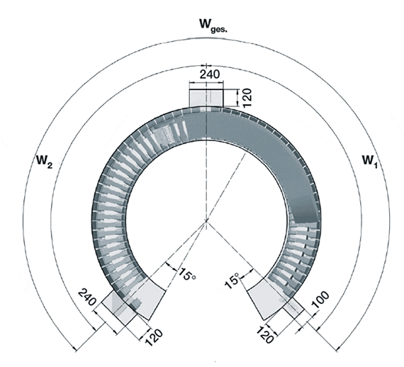 | W1 = Winkel Obertrumrinne | W2 = Winkel Untertrumrinne |