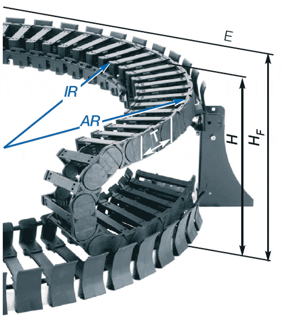 Grundsätzlich wird der Ketten-Biegeradius R von dem kleinsten Biegeradius der Leitungen bestimmt. Auswahl durch die Tabelle der entsprechenden Serie.