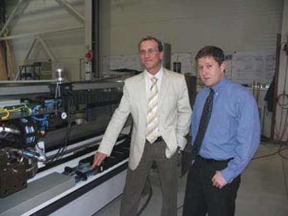 Oliver Fechner (li.), Stephan Bobritz (re.): „Vorkonfektionierte Energiezuführung für unsere Neuentwicklung – ein Hochgeschwindigkeits-Bearbeitungszentrum zum Drehen, Schleifen und Polieren von Tiefdruckzylindern. Es setzt am Markt Maßstäbe!