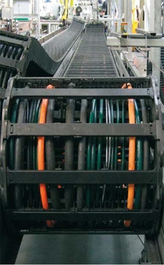 So auch die Langzeituntersuchung der chainflex® Servoleitungsfamilien CF21.UL und CF27.D. Diese auf dem Baukastensystem basierenden Servoleitungen, die sich im Fertigungsdetail nur durch ihre Innen- und Außenmantelwerkstoffe unterscheiden, wurden über 2,5 Jahre im Labor bei einem Radius von 100 mm, einem Verfahrweg von ca. 8 m, einer Beschleunigung von ca. 6 m/s² und einer Geschwindigkeit von ca. 3,5 m/s getestet.