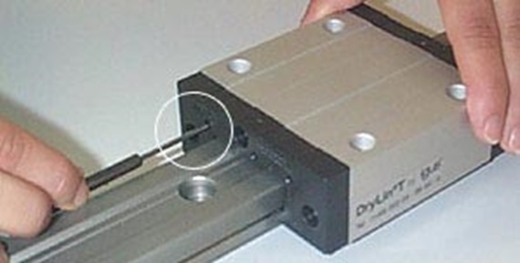 Sollte das Spiel zu eng eingestellt worden sein, so dass der Führungsschlitten klemmt, genügt es nicht, nur die Inbusschrauben zurückzustellen. Betätigen Sie nach dem Zurückschrauben zusätzlich den Rückstellknopf auf der den Schrauben gegenüberliegenden Seite, um die Gleitelemente wieder zu lösen. Benutzen Sie dafür einen Stift folgender Größe: