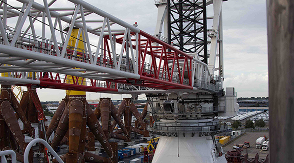 Geänderte Kranversorgung auf einem Errichterschiff: Eine XXL-Energiekette mit rückwärtigem Biegeradius soll als Alternative zu einem Schleifring die Strom- und Signalführung sichern.